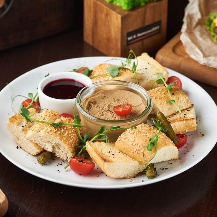 Паштет із курячої печінки з грінками та малиновим джемом – ніжна, кремова текстура паштету в поєднанні з хрусткими грінками, солодкуватим малиновим джемом, соковитими помідорами чері та руколою.